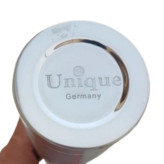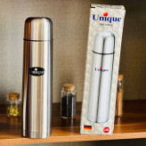 این فلاسک از سری فلاسکهای برند معروف یونیک است که بدنه آن از داخل و خارج از جنس استیل ضدزنگ ساخته شده و دارای طراحی دوجداره است. به همین دلیل قابلیت این را دارد که دمای مایعات گرم یا سرد 12 ساعت در حد مطلوب نگاه دارد. درب این فلاسک به صورت پیچی باز و بسته میشود و روی این درب یک ضامن فشاری تعبیه شده تا با فشردن آن بتوان مایعات را خارج کرد. این ضامن را اگر تا انتها فشار دهید در جای خود قفل میشود و خروجی فلاسک باز میماند. برای بستن خروجی کافیست که بخش بالاآمده را فشار دهید تا خروجی کاملا بسته شود. یک عدد لیوان کوچک هم بر روی این درب بسته میشود که علاوه بر کاربردی بودن، به زیبایی این فلاسک هم کمک میکند. کمپانی یونیک برای محصول خود یک عدد کیف هم در نظر گرفته که برای سهولت در حمل یک بند هم به آن دوخته شدهاست توجه داشته باشید که در زمان آزمایش درب فلاسک را باز نکردیم چون با هر بار باز شدن درب فلاسک حداقل 10 درجه دما کاسته میشود مورد بعدی اینکه آب داغ را تا حد بالای فلاسک کامل پر نکنید که در حالت ایستاده فلاسک درب و واشر با آب جوش در تماس باشد .