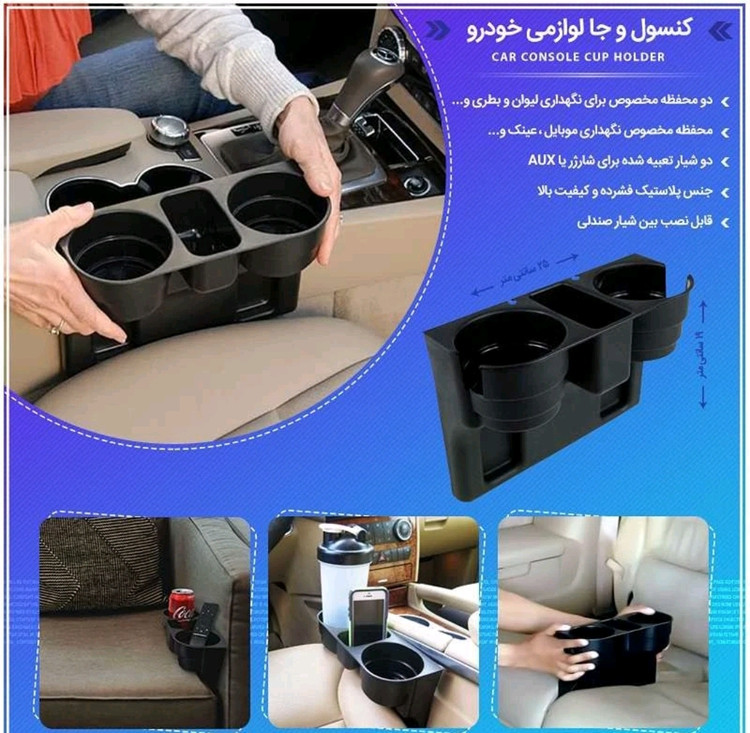کنسول کنار صندلی ماشین ، تولید شده از جنس پلاستیک مقاوم و باکیفیت می باشد که بر روی خود طراحی شبکه ای دارد ، خصوصیتی که در کنار شکل ظاهری کالا توانسته زیبایی و جلوه ای منحصربه فرد را برای آن پدید آورد به طوری که به سادگی می توانید جا لیوانی را درون خودرو های مختلف داخلی و خارجی (متناسب با ابعاد و شکل ظاهری پایه محصول) استفاده کنید . فضای داخلی ارگانایزر شامل محفظه ای برای جای گیری یک بطری و یا لیوان ، محفظه مستطیل شکل با تفکیک کننده میانی برای قرار دادن لوازم و وسایل مختلف نظیر کیف پول ، مدارک ، تلفن همراه ، دسته کلید و ... به صورت منظم با امکان دسترسی آسان می باشد ، البته روزنه ای در زیری محفظه تعبیه شده که می توانید کابل شارژ تلفن همراه خود را از داخل آن عبور دهید بدین معنا که حتی به هنگام شارژ ، می توانید موبایل را بدون ایجاد مزاحمت درون کنسول جای دهید . بر روی سطح پایه جا لیوانی کنسول خودرو ، یک پد ضربه گیر قرار داده شده که مانع از آسیب دیدن روکش صندلی در حین استفاده از کالا خواهد شد ، بنابراین با خیالی آسوده می توانید جا لوازمی خودرو را در کنار صندلی جای داده و استفاده نمایید .